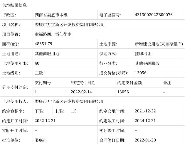掛牌出讓供地結(jié)果信息(婁底市萬寶新區(qū)開發(fā)投資集團有限公司-幸福路西、霞仙街南)